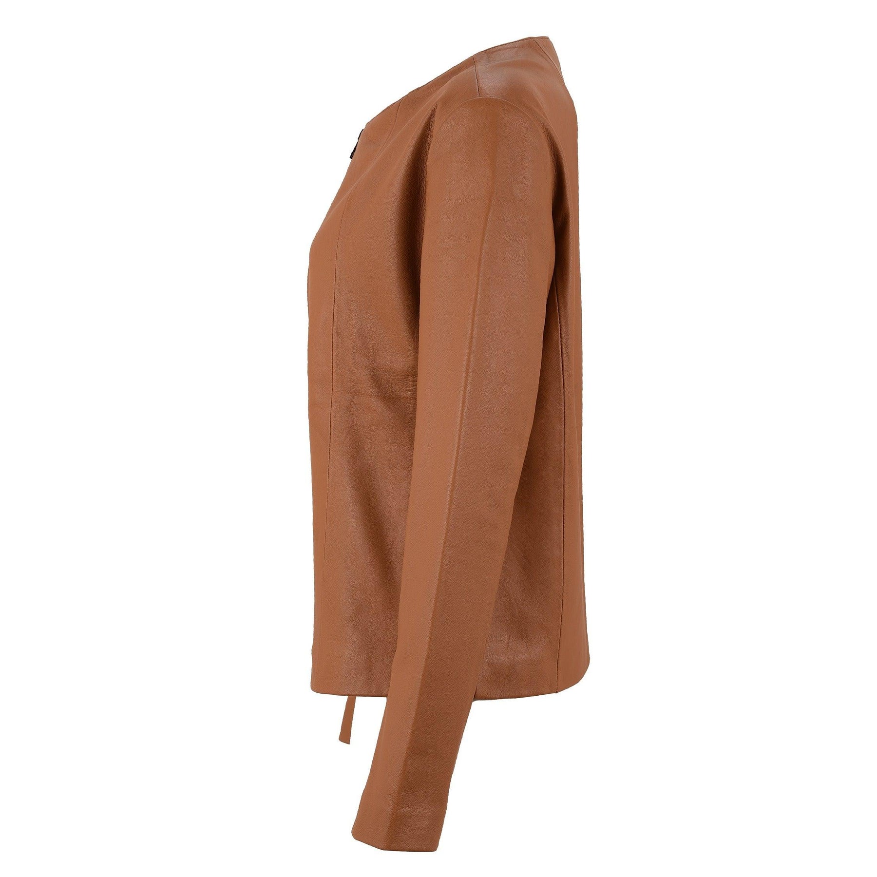 This leather jacket for women features a classic design with no lapels, collars, pockets, or quilted embroidery. This leather jacket women beauty lies within its simplicity with the round neckline and thin zipline. The long sleeves also don't feature any unnecessary detailing or cuffs.
